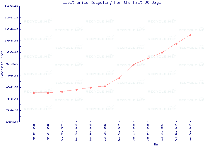 Electronics Recycling Composite IndexThe Electronics Recycling Composite Index tracks the changing market prices in the Computer Recycling and Waste Electronics Recovery industry . The Index consists of a weighted basket of 8 benchmark grades of electronics scrap. The Index includes snapshots of 5 viewpoints of market trends : the past 7 days, past 30 days, past 90 days, past 1 year and past 2 years.The Composite Index is updated daily before noon EST and tracks 7 days per week. Transaction activity on the weekends is typically lighter; it is not uncommon to see no change reflected in the Index during this time period. The Composite Index is derived from current spot market prices originating from the Electronic Exchange System (EES). This source of data is proprietary in nature and may not reflect external markets trends. To keep current with the market trends, you may visit this website. The overview of the Composite Index is a free service.